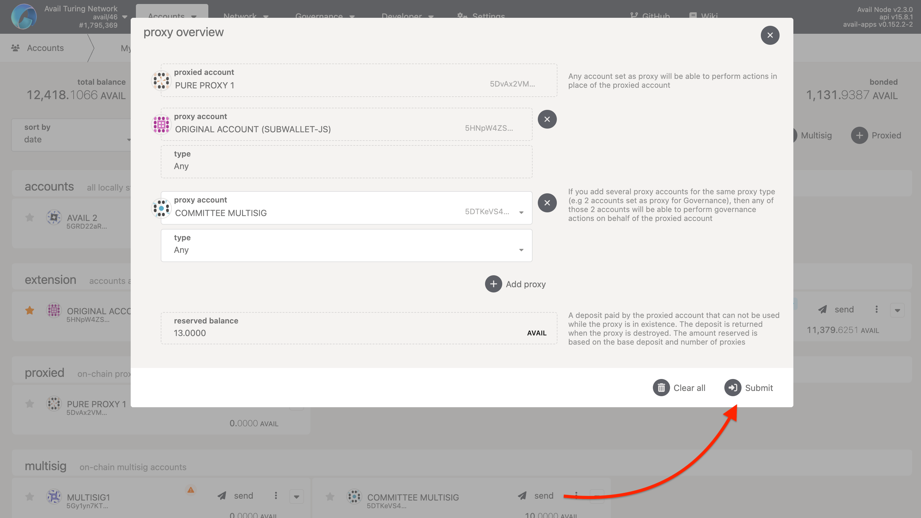 - Click on the ‘Add proxy’ button and select your multisig address from the dropdown menu as the proxy.