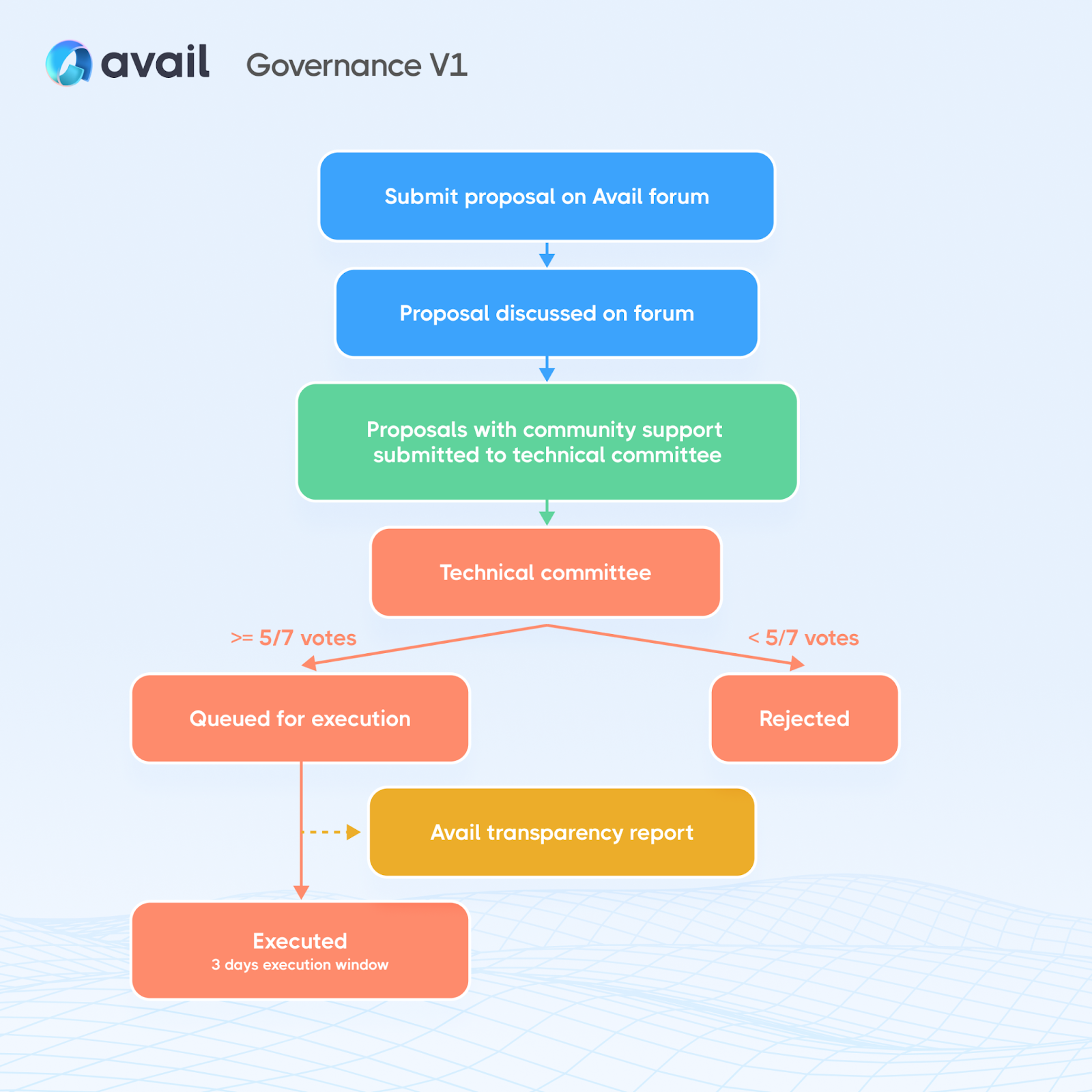 This is the initial phase of Avail’s governance. This initial phase provides the community with a clear way to propose, discuss and keep up to date with changes to the Avail network. It seeks to provide the Avail community with a meaningful way to discuss, propose and challenge network upgrades while ensuring that malicious actors cannot dominate the network.