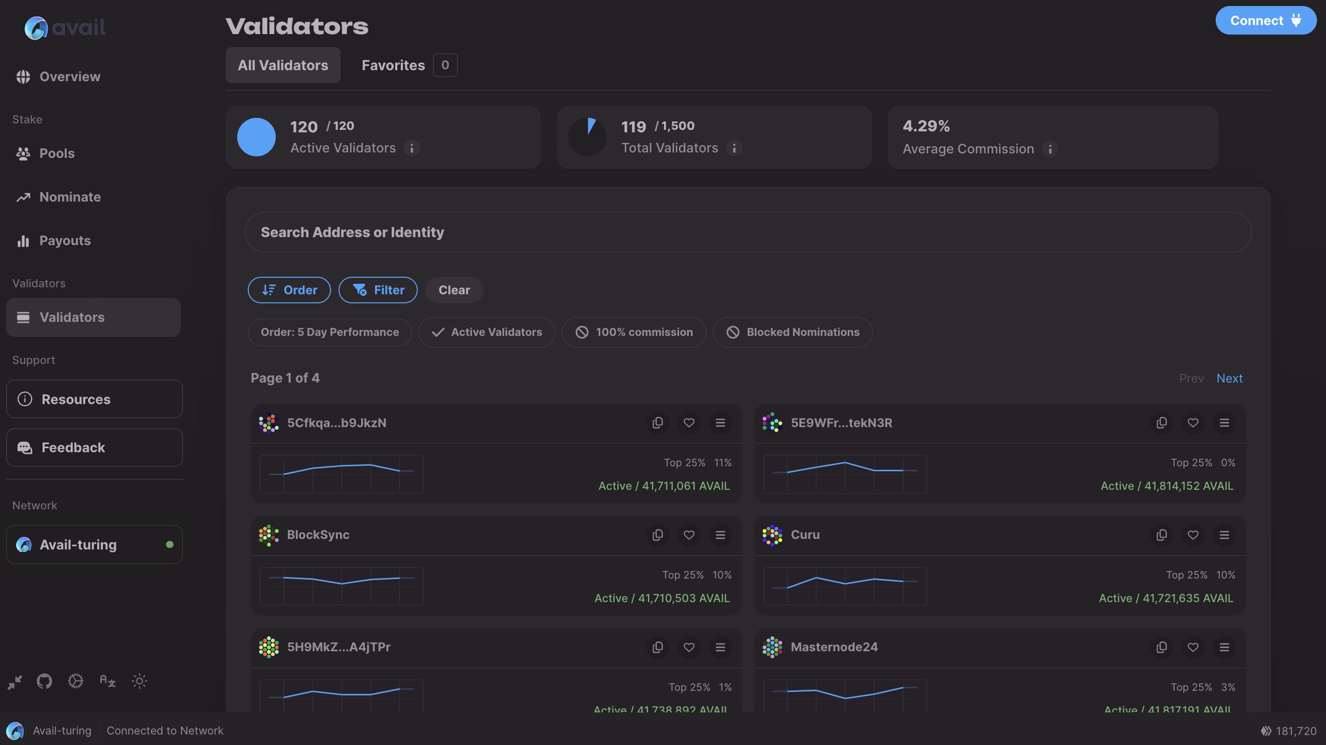 You can click on the Validators tab in the left sidebar to view a list of validators currently active on Avail DA. The dashboard allows you to filter out validators based on a number of criteria so you can make an informed choice.