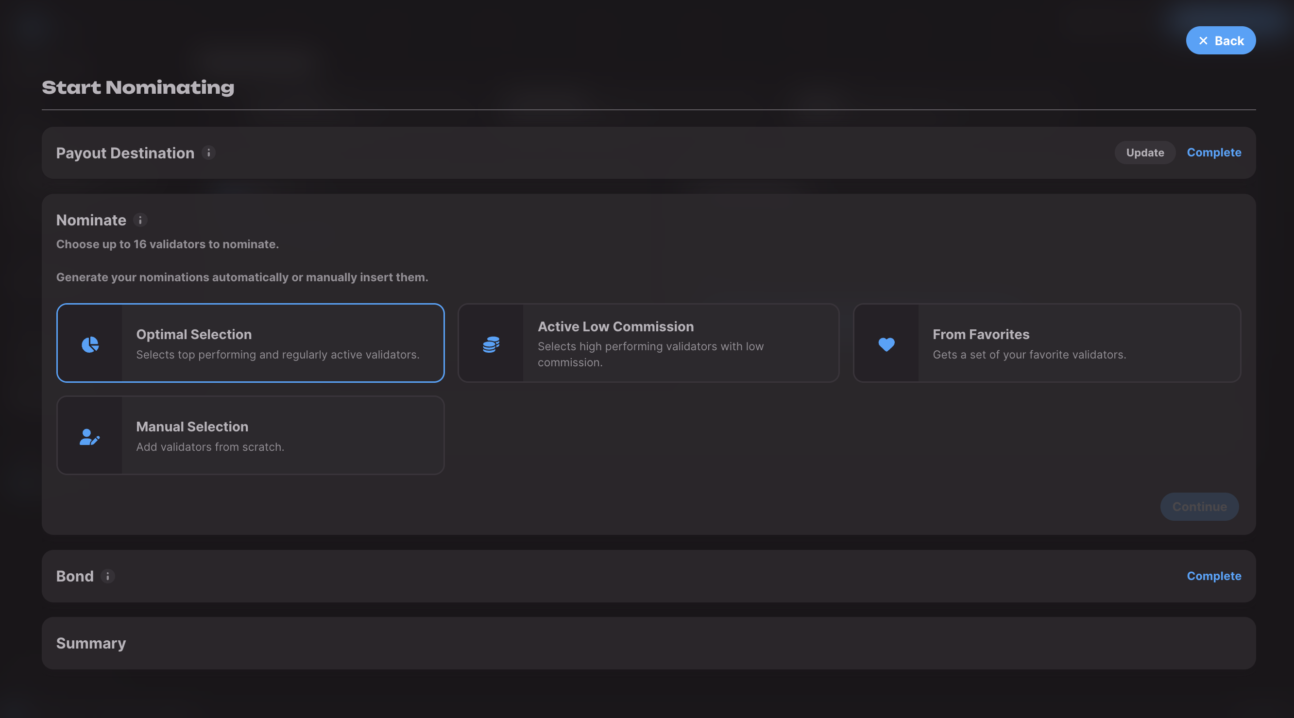 • Optimal selection: Allow the dashboard to simplify the whole process and fetch a list of upto 16 validators for you to nominate.