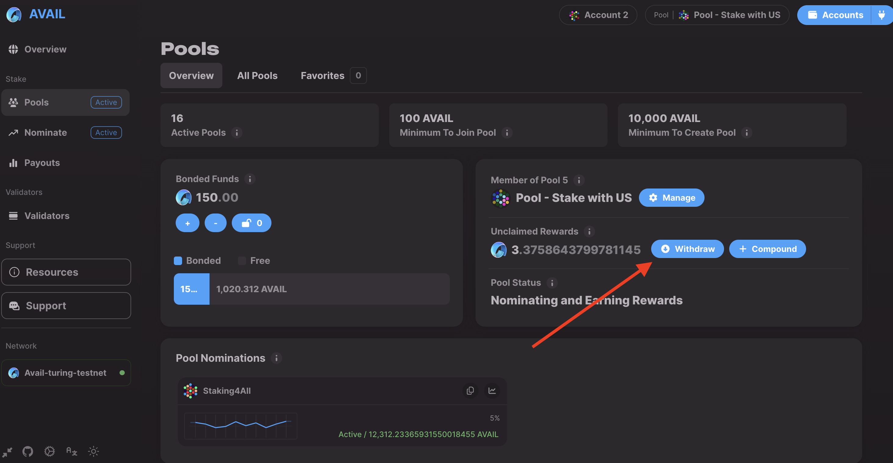 After a few days you will see unclaimed rewards adding up for your account in the staking dashboard. You can either withdraw these rewards to your account or compound them back into the pool.