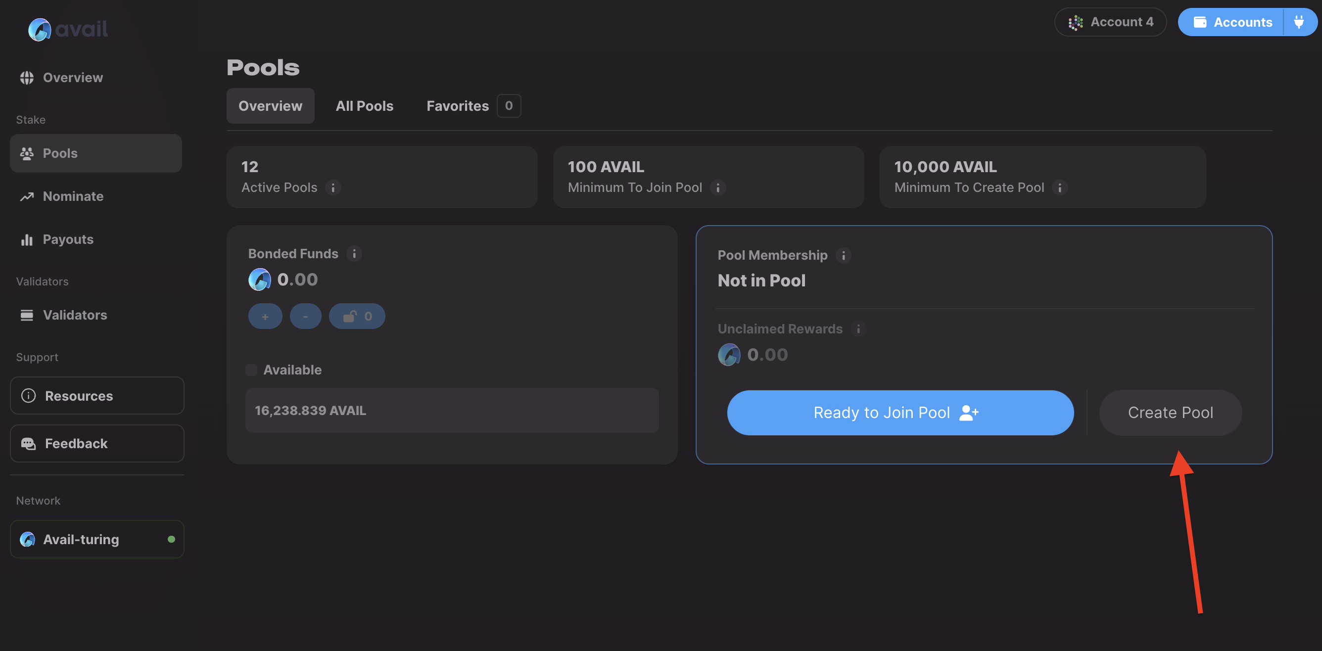 The only prerequisite for creating a new nomination pool on Avail DA is that you have an Avail DA compatible wallet with a minimum of 10000 AVAIL in it.