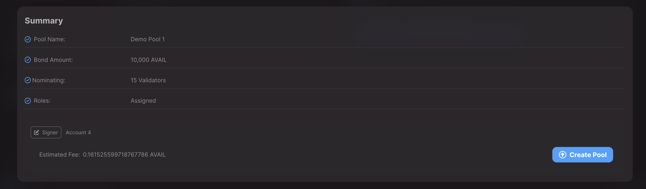 Once you have configured your settings, you can join the pool with any amount ≥ 100 AVAIL. Simply click on Join Pool and approve the transaction.